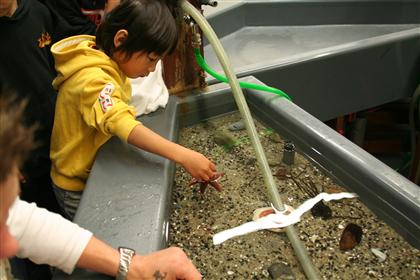 お兄ちゃんのお楽しみは、Touch Pool。カニやヤドカリ、ウニやヒトデに加えて、カレイの稚魚もいた。たしかにこの辺(オアスン海峡)はカレイが良く獲れる。地元の名産というところだ。なかなか、カレイが泳いでいるところって見たことが無いと思う。面白いよね。